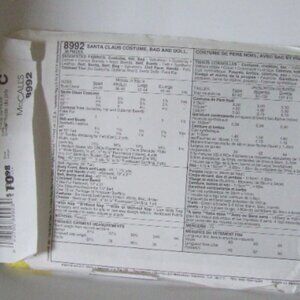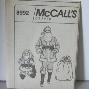 Vintage McCall's uncut pattern 8992. Santa costume, bag and doll. Printed in 1997 in the USA. Men's size large 42 to 44. The recommended fabrics include wool blends, velveteen, and cotton blends.
