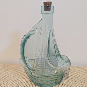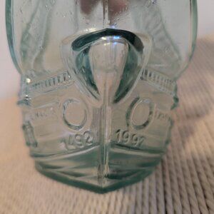 This collectible blue green/glass bottle decanter was made in Italy at the Veteria Etrusca glassware manufacturer in 1992 to mark the 500 year anniversary of the Santa Maria ship.