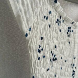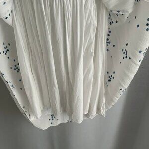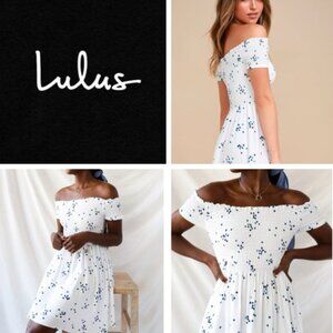 Lulus Exclusive! Pair the Lulus Santa Monica Pier Blue and White Print Off-the-Shoulder Dress with a sunhat, some sandals, and a sunny day! Light and breezy woven fabric forms a smocked bodice and short, off-the-shoulder sleeves atop a lightly flared, mini skirt. A fun blue and white dotted print adds a beachy touch.