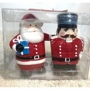 This charming set includes festive Santa and Nutcracker-themed salt and pepper shakers with matching spreaders. Ideal for enhancing holiday dining experiences.