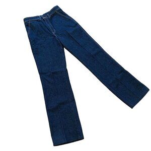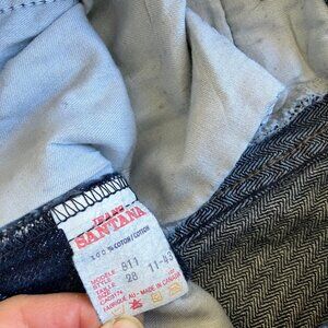 Vintage Santana brand jeans in dark wash denim with a subtle pinstripe. Slant pockets at front of hips with a single welt pocket on the back. 100% cotton, made in Canada. Tag size 28 - see below for garment measurements. Pre-owned condition: hemmed to 30.5" inseam length. Thick, quality denim is in excellent condition - appears only lightly worn. The pictures show the actual item that you will receive.