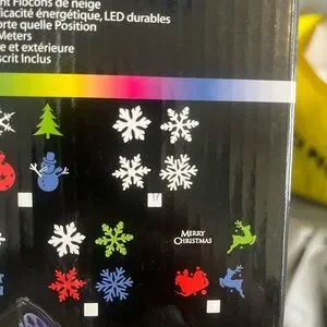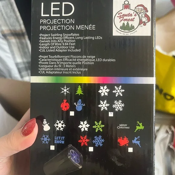 LED projection light with festive holiday designs. Features white snowflakes.