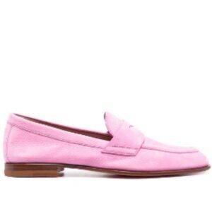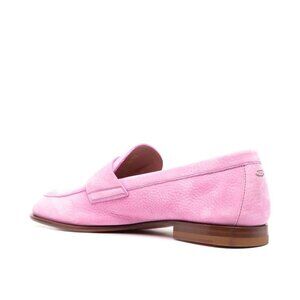 light pink calf suede penny slot slip-on style almond toe branded leather insole low block heel rubber outsole