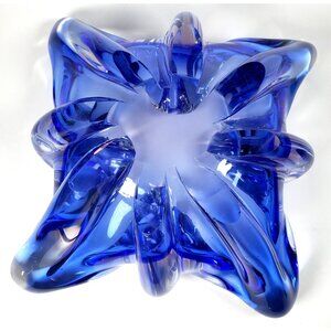 Vintage Sanyu art glass ashtray. Blue and pink-tinged cased in clear glass.