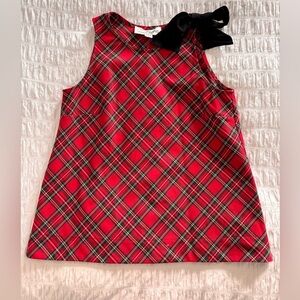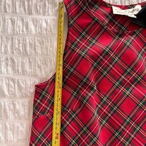 This vibrant and festive top by Sara Campbell features a sleeveless design and a charming peter pan collar. The boxy style offers a relaxed fit, making it perfect for casual outings. The black trim adds a touch of contrast to the classic tartan pattern. Worn once and in excellent condition.