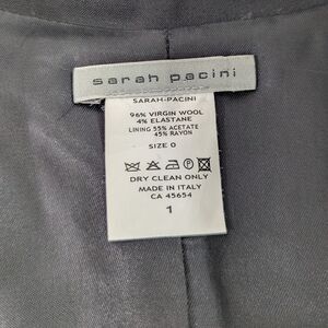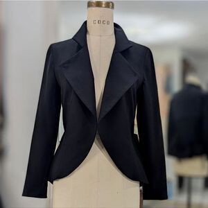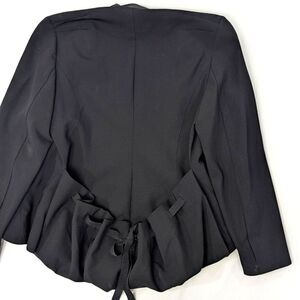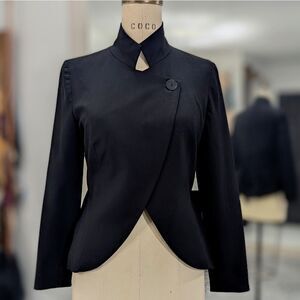 A couple of different looks makes this piece a unique capsule piece. In the closed position, the front lapel has a utilitarian feel, contrasted with a feminine gathered peplum that is adjustable with a high quality cross grain ribbon through the back. The open position shows off a wide lapel, while both positions snatch the waist.