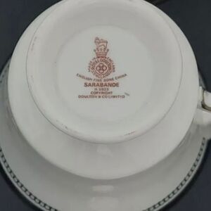 The Sarabande pattern by Royal Doulton came out in 1972 and remained active till 1998. The pattern has a black border and an intricate platinum trim to go with it. The border even has black intermingled circles. The white color in its base makes it easy to mix and match with your existing kitchen sets.