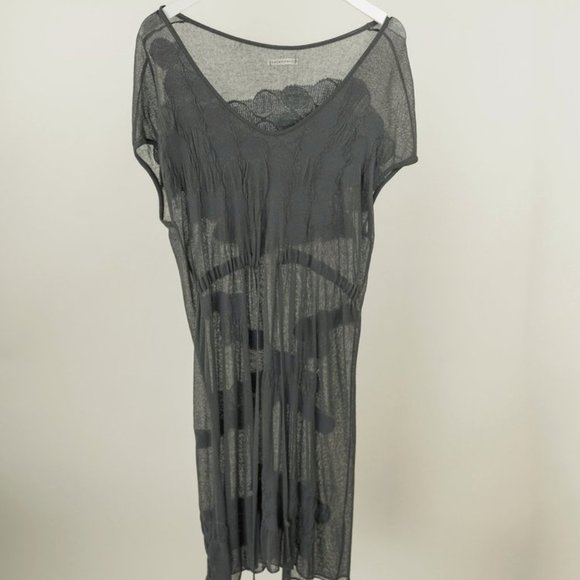 This midi-length dress from Sarah Pacini is made in a lightweight grey mesh knit with puckered circle inserts, and features cap sleeves, a rounded neck, and a drawstring waist.