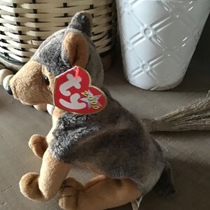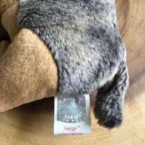 Sarge is a German Shepherd Dog with a tan brown body and face and a mottled brown back and head. He has black button eyes and a black nose with black stitching for his mouth.