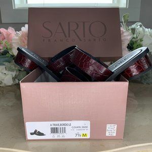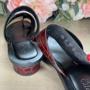 Rich bordeaux burgundy croc leather with a 1.5" circular block heel. Only worn outside once. See a few scuffs at toe area, as seen in pics. Comes with original box.