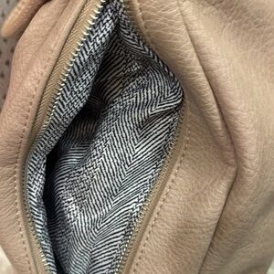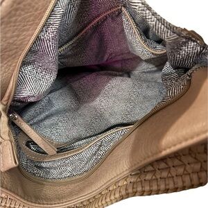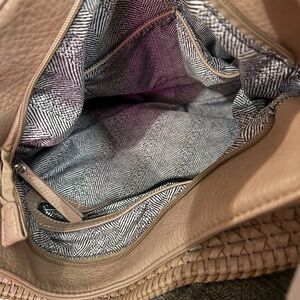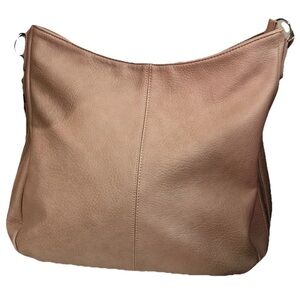 Stylish tan faux leather bag by Sasha + Sofi. Features a sleek design with a zip closure.