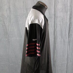 Up for sale is a Saskatchewan Roughriders centennial jersey by Reebok. It has a grey body with black sleeves and red trim. The jersey is blank and could be personalized. This jersey was only released in 2010. What a rare addition to any collection.
