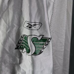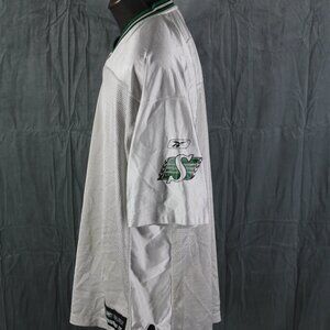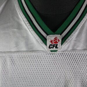 Up for sale is a retro Saskatchewan Roughriders jersey by Reebok. It has a white base colour with green trim. Each sleeve has the modern Saskatchewan Roughriders logo screened on. The front and back of the jersey are blank so it could be personalised. What a great jersey do not miss out on it.
