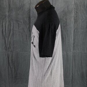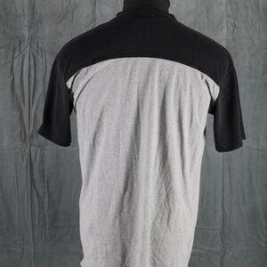 Up for sale is a vintage Saskatchewan Roughriders shirt. It has a black upper portion and sleeves and a grey body. The midsection of the shirt has Canadian football and the Roughriders logo screened on. What a great shirt do not miss out on it.