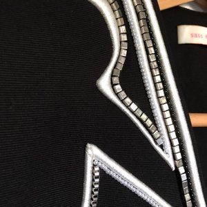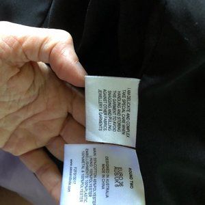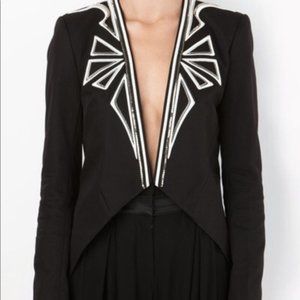 Standout fitted, structured jacket with white threading in a geometric motif with black, pearl & metal embellishments. A stylish, chic signature jacket from one of Australia's favourite designers. Asymmetrical hem with two tails at the back. Padded shoulders. Fully lined. 55% Cotton/45% Polyester. Size AU 6, or North American 2. Perfect condition; no missing beads, stains or pulls/loose threads. Only worn a few times. Retail is $795 AUD!
