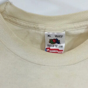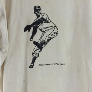 Fruit of the loom vintage men’s Tee with image of Satchel Paige on the front, and Satchel's "6 Maxims for a Happy Life" on the back. There are signs of wear including staining and discolouration (see photos). Size XL with a 22” pit to pit measurement. Made from 100% cotton.