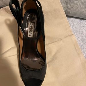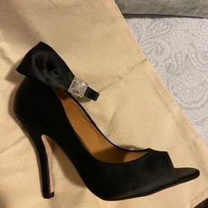 Step out in style with this fabulous open-toe pump from Badgley Mischka. The Sublime features a sleek fabric satin upper with an ornate ankle wrap that is elegantly jewelled