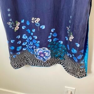 Satin Embroidered Tunic Top Blue Asian Print. No tags. Feels like a silk satin material, see video. Heavily embroidered floral print. Sheer embroidered sleeves. Super gorgeous Johnny Was inspired piece. Fits like a small. Check measurements to ensure fit. Good condition, has a small pull on the right shoulder seam.