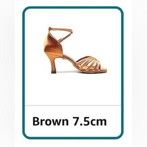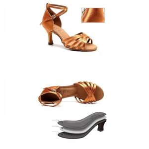 These brown/burnt orange heels feature a stylish open-toe design with multiple thin straps for added support and flair. The moderately high, flared heel is perfect for dancing, ensuring both elegance and comfort. Final sale on this item. Please read the details and description carefully.