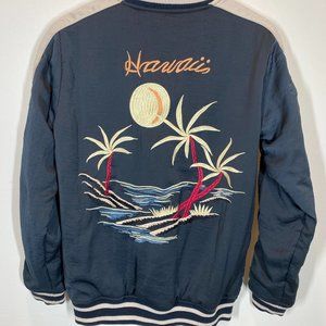 Capulet Mai Tai Bomber Jacket Souvenir Hawaii Palm Trees & Birds Embroidered Navy & Oyster sz S. Vintage-look embroidered Hawaii souvenir bomber jacket by Capulet. In matte navy satin with a drapey boyfriend fit featuring vertical stripes down the arms + striped ribbed knit hems for a varsity vibe. Finished with hand warmer pockets, a zip-up front + embroidery at the chest + back.