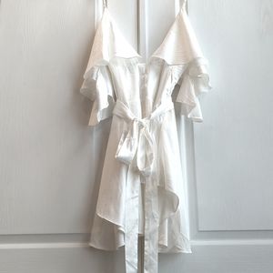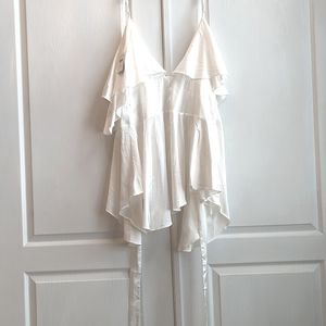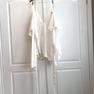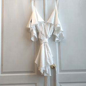 New with tags, never worn or washed. It's been hanging up for a while and could use a good steaming, or ironing for the wrinkles. There is approx. 4 small "picks" (cat) on the wrap tie, but it is completely unnoticeable, I tried to capture it in the video. Difficult to get a good picture, but the stock photos show it beautifully! I purchased from Fashion Nova, with every intention of wearing it myself, but it just shows too much boob for a large chested gal lol