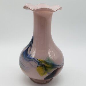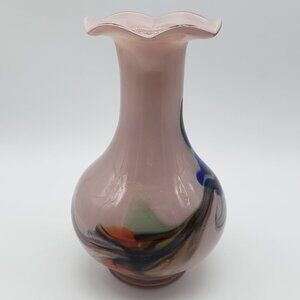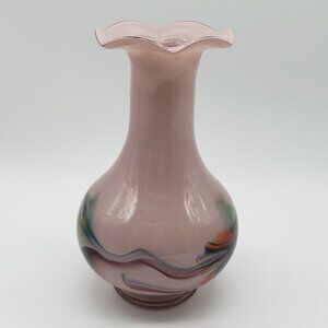 Satin Pink or Violet Multicoloured Swirls Spots Crimped Top Art Glass Vase