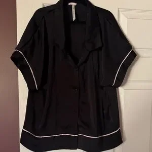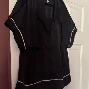 Elegant black satin button-up shirt featuring pink trim. Perfect for a chic look.