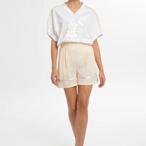 Satin Shorts With Elastic Back And Embroidered Piping Details in Ecru