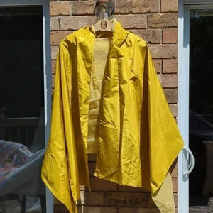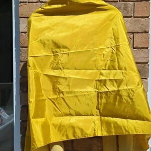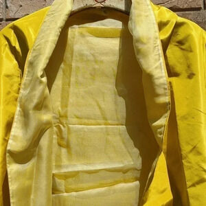 This colour is somewhere between Lemon yellow and Canary yellow. Its beautifully vibrant and intense. It is a heavy stiff satin with a lining of something like Chiffon/Organza/Georgette. Its probably my Grandmother's from the 1950's or 1960's. There are two snaps that probably attached to the back of a dress. I do not have the dress. This would have been a custom piece made by a Toronto Seamstress. Included in this purchase is a large remnant piece. The wrap has some age related damage/marks, see pictures.