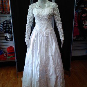 Satin and Lace Long Sleeve Wedding Dress with 6ft Train Beaded Lace Bodice