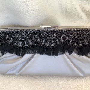 Silver satin and black lace evening bag can work as a clutch or use with chain as a purse.