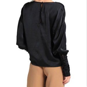 ONLY Satin black blouse. 100% Polyester, satin, frills, solid color, round collar, long sleeves, buttoned cuffs, 1 button (back).