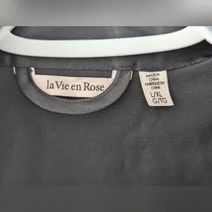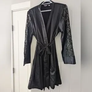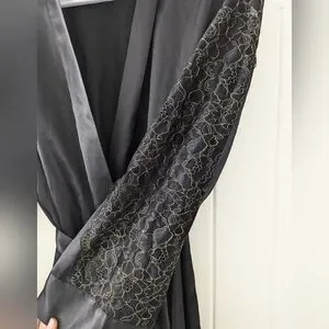 Black satin La Vie en Rose robe (US L/XL) with black and gold lace detailing on the sleeves, waist tie and pockets.