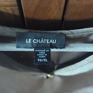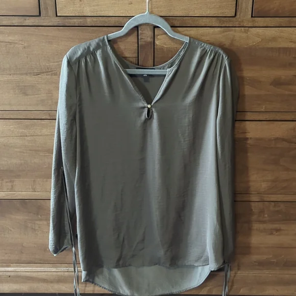 Le Chateau satin top, olive green, barely worn. Has cold shoulder/slit arm detailing with golden buttons. Size XL, polyester.