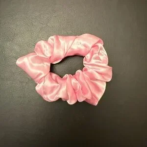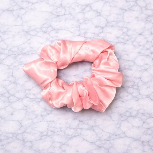 Elegant satin scrunchie in a soft pink hue. Perfect for adding a touch of style to any outfit.
