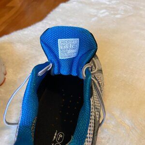 Silver and blue mesh upper with durable overlays—lightly worn with clean overall condition.