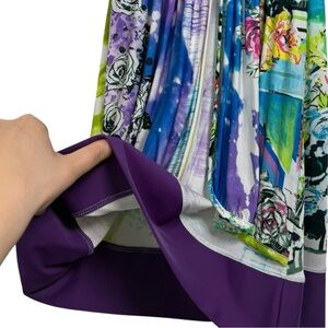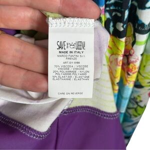 Rare true Y2K-era vintage Save The Queen halter dress, made in Italy. Features a vibrant multicolor abstract floral print, deep V-neckline, multiple straps and draped overlay panel in the front—a lightweight layer that falls loosely over the fitted base of the dress. Perfect for summer parties, vacations, or festival wear.