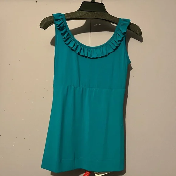 Tantilizing turquoise tank with ruffle detail. Sleeveless design with a sexy deep v-cut at the back. Perfect for versatile styling!