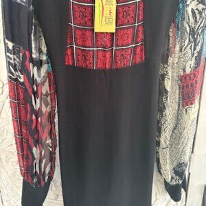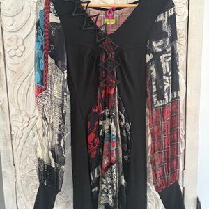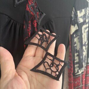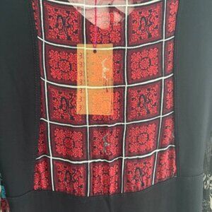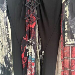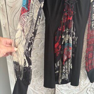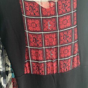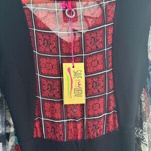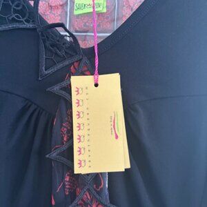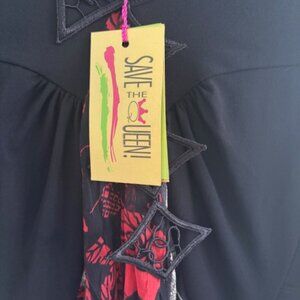 Gorgeous Save The Queen Top Vintage. Never worn. It's a large but fits snugly. Made in Italy. Gorgeous black lace on one side that hang loosely from the v neck front. Amazing detail. The black fabric has some stretch to it. Original tags.