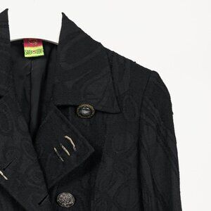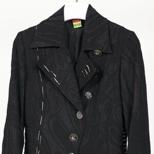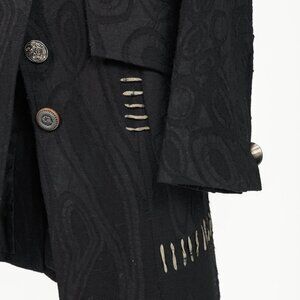 Made in Italy, this coat from Save the Queen circa 2007 is crafted in a black wool with a textured abstract jacquard throughout, and is accented with contrast oversized stitches. It features long sleeves, slit cuffs, lightly-padded shoulders, a notched lapel collar, mixed front button closures, front flap pockets, a buttoned back waist strap, a back vent, and is lined in a tonal solid satin.