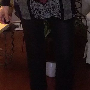 reds and greys mixes with touches of blue, The long sleeves are bell-shaped. V neckline with a lave applique. Suitable to be worn with basic trousers. super elegant and for every occasion. This garment is from Italy and it is a statement piece. I own many Save the Queen items and they never go out of style.