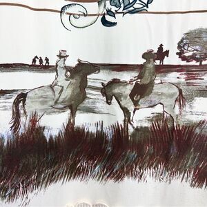Has a really great horseback riding / western print on front and back and crochet lace detail at hem . Stretchy viscose top layer with a soft nylon liner underneath .