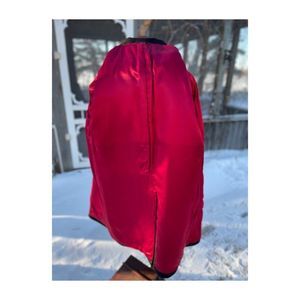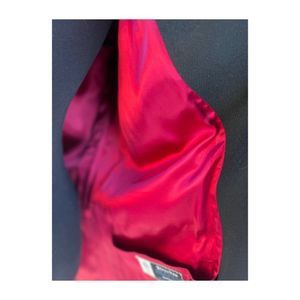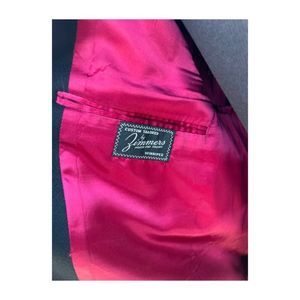 Savile Row Virgin Wool Formal Coat custom tailored by Zimmers in Winnipeg. Fully lined in red satin, the contrast color peeks from pocket square to double front flap closure pockets. Single breast, 3-button closure. Notched collar. Strachan coating for weather protection. Double inner pockets. Extra buttons sewn to lining. No stains, no moth damage, no holes or tears. Pet and smoke-free estate.