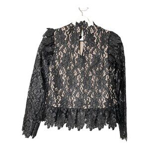 Saylor Jasmyn Long Sleeve Coated Lace Top Black. Coated black lace with nude lining on body. Open lace on arms. Ruffle detail down front, on shoulders and around hem. Higher at front. Bits of lace to create a slight mock neck collar. Keyhole back with button closure at top. No known flaws.