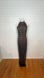Stunning Scala sleeveless gown with intricate black lace, beige lining throughout, heavily beaded, front side slit 23” L, invisible zipper to centre back 21” L, eye and hook closure to back of neck and fabric has no stretch.