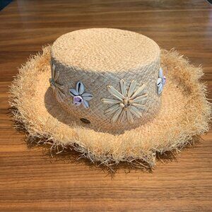 Scala natural straw hat, applied shells, straw flowers, adjustable hatband, EUC