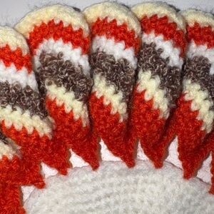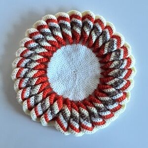 9" crocheted doily in warm retro colours: cream, orange, and brown.