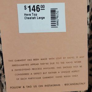 Scandal Hera Top. Cheetah. Size L. NWT. 100% Viscose. Hand Made with love from Italy. Leopard print peasant top designed with the traditional split neck and double ties. Featuring long sleeves with elastic cuffs. There is a small amount of fraying on the top rope ties. Please refer to the pictures and read Scandal's message on their tag.
