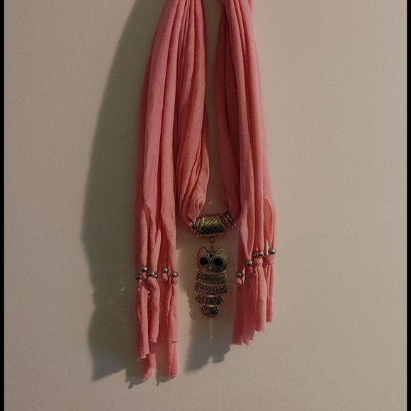 Pink scarf, metal breads on the fringe eñds and a beautiful owl hanging in the middle