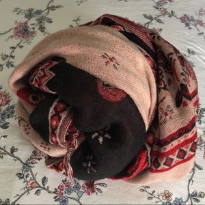 Reversible scarf with beautiful designs black, red and cream one side and pink, red and black the other. Double layered so is warm - very soft, too.